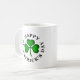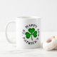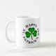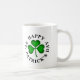 Eine weiße Tasse mit einem grünen irischen Kleeblatt Kleeblatt-Design und einem schwarzen "HAPPY ST. PATRICK'S DAY" Text um ihn herum.
