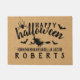 Klassische und elegante Halloween-Fußmatte für Fall - Text "glücklichen Halloweens" mit Schlägern, einer Fliegenhexe, einer Spinne und Ihrem Familiennamen