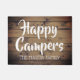 Spaß, rustikales hölzernes Dekorgeschenk im Freienfür pensionierte Paare, Wanderer, rvers, Lagerbewohner und die personalisierten Naturliebhaber, hölzerne Blickfußmatte der Scheune liest "glückliche Lagerbewohner" in der mutigen, handgeschriebenen Blickbeschriftung und in der Textschablone unten für Familiennamen (oder irgendeinen kundenspezifischen Text) unten addieren in der weißen, eleganten Beschriftung. Gegen einen Hintergrund der rustikalen, alten hölzernen Bretter. Großes Ruhestandsgeschenk, auch. Würde vor einem RV oder einem gemütlichen Blockhaus zu den willkommenen Gästen perfekt schauen.