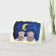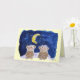 Niedliche Cartoonaffen sitzen unter einem Bananenmond mit einer starry Nacht der funkelnden Sterne in einem speziellen Moment ihren Jahrestag zusammen feiernd. Lustiges Sprichwortinnere liest: "Glückliches Bananaversary!" und dann auch "ich bin, also froh trafen uns wir"
