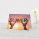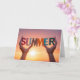 Die Hände halten farbenfrohe Buchstaben hoch, die "SOMMER" vor einem lebendigen Sonnenuntergang buchstabieren. Inside message kann geändert werden.