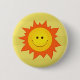 Niedlicher Knopf mit einer glücklichen lächelnden Sonne auf grünem gestreiftem Hintergrund. Dieser nette Sonneknopf zeigt der Welt, welche Sonnenschein-y Person Sie sind. Groß für reizende Kinder und für Erwachsenkinder, auch. :)