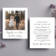 Einfache und schicke preisgünstige Unterkunft oder kleinere Hochzeitsankündigung und Post-Hochzeitsempfang oder Party Einladung. Die Vorderseite zeigt Ihr Foto in einem ausgeschnittenen quadratischen Rahmen, "glücklich immer nach" geschrieben in einem trendigen Drehbuch mit Swashes und Ihre Vornamen und Hochzeitstag und Ort in der modernen Typografie. Auf der anderen Seite können Sie Ihre Hochzeitsankündigung detaillierter gestalten, einen Empfang oder eine Party Einladung hinzufügen und Ihre verheirateten Namen in einem signaturähnlichen Skript unterschreiben.