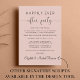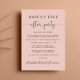 Stilvolles Rosa-Ambiente oder private Hochzeitsankündigung und Einladung zum Empfang. An der Vorderseite steht "Happily Ever After Party" in einer Mischung aus einfacher Typografie und einem eleganten Drehbuch mit Swashes, und Sie können Ihre Nachricht und Einladung personalisieren und Ihre Namen in einem signaturähnlichen Skript hinzufügen. Auf der Rückseite geben Sie Ihre URL-Adresse der Hochzeit-Website ein, um einen QR-Code für Gäste zu erstellen, um nach allen Details zu scannen und online zu UAWG.