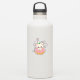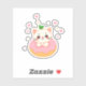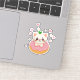 Kawaii-Katze sitzt in einem rosa glasierten Donut mit einem kleinen Blatt, lächelt mit rosigen Wangen, umgeben von Sternen und Herzen.