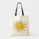 Zeichnen einer Sonne mit einem glücklichen Gesicht auf einer natürlichen farbigen Leinwandtasche; die schwarzen Griffe auf der Tasche beglückwünschen die schwarze Grenze um das Bild