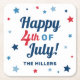 Stilvolle patriotische Amerikanische Unabhängigkeitstag Urlaub individuelle Untersetzer Design bietet ein "Happy 4. Juli" Zitat Schrift Typografie Textdesign in rot, weiß, blau und marineblau mit Sternakzenten. Personalisieren Sie den marineblauen Text mit dem Namen Ihrer Familie oder einer anderen bevorzugten Formulierung.