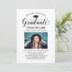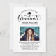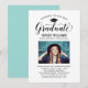 Elegante Abschluss-Ankündigung Karte und Abschlussfeier Einladung gratuliert und kündigt Ihren Absolvent in der Art! Die schwarze Graduiertenkappe, "Graduate" in der Schrift und der moderne, benutzerdefinierte Text, der mit dem Namen, der Schule und dem Party des Absolventen personalisiert werden kann. Fügen Sie ein beliebtes Foto des Abschlusses hinzu. Beachten Sie, dass die hellblaue Aqua-Akzent-Farbe auf der Kartenrückseite in Weiß oder eine andere Farbe geändert werden kann, die mit den Foto- oder Party-Farben koordiniert wird.