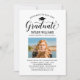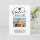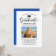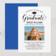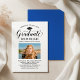 Elegante Abschluss-Ankündigung Karte und Abschlussfeier Einladung gratuliert und kündigt Ihren Absolvent in der Art! Die schwarze Graduiertenkappe, "Graduate" in der Schrift und der moderne, benutzerdefinierte Text, der mit dem Namen, der Schule und dem Party des Absolventen personalisiert werden kann. Fügen Sie ein beliebtes Foto des Abschlusses hinzu. Beachten Sie, dass die klassische Farbe Blau/Akzent der Marine auf der Kartenrückseite in Weiß oder eine andere Farbe geändert werden kann, die mit den Farben Foto oder Party koordiniert wird.