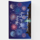 Einzigartiges und schönes Feuerwerk in Rot, Weiß und Blau mit der Freiheitsstatue in einer Silhouette von New York City zum Unabhängigkeitstag. Alles Gute zum 4. Juli!