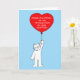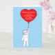 Eine flauschig weiße Katze mit einem großen roten Ballon, der auf ihm geschrieben hat Sprichwort "Herzlichen Glückwunsch zur Fertigstellung Ihrer Adoption".
