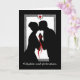 Tillykke med forlovelsen. Herzlichen Glückwunsch zur Verlobung, Papier Grußkarte in Dänisch, Dansk geschrieben. Elegantes Schwarz-Weiß-Design mit rotem Herz, rotem Band, silberfarbenem Mann- und Frauenpaar und einem aufwändigen Rahmen. Inside text übersetzt als "Beste Wünsche für Ihre gemeinsame Zukunft". Art, Bild und Vers Copyright © Shoaff Ballanger Studios, 2022.