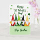 Diese Grußkarte zeigt fünf Gnome, die Seite an Seite auf weißem Hintergrund aufgereiht sind, ihre hohen spitzen Hüte sind mit Punkten versehen und ihre langen weißen Bärte fließen über helle Outfits. Von links nach rechts hebt ein roter Gnom einen goldenen Becher, als ob er einem Freund zuproste, gefolgt von zwei grünen Gnomen, die sich subtil der Gruppe zuneigen, als ob sie an einem gemeinsamen Scherz beteiligt wären 💚. Daneben steht ein in Schwarz gekleideter Gnom, der ein Kleeblatt nah am Körper hält und eine zarte, liebevolle Note hinzufügt ☘️. Ganz rechts wiegt ein orangefarbener Gnom einen klassischen Goldtopf, wodurch die Reihe mit einem gemütlichen, gemeinsamen Feiergefühl abgeschlossen wird. Zentriert über den Gnomen erscheint der Text „Happy St. Patrick’s Day!“ in grüner Schrift, der sich über den oberen Rand wölbt. Unter ihren Füßen erstreckt sich horizontal eine hellgrüne Wasserfarben-Waschung, darauf steht in passendem Grün „Step Brother“. Kleine