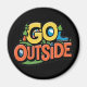 Eine lebendige und spielerische Illustration, die die Erkundung im Freien fördert. Die Wörter "GO OUTSIDE" werden mit einem Hintergrund hervorgehoben, der sanfte Hügel, Pinienbäume, einen Wanderstiefel und einen Blick auf einen bunten Ball zeigt, der Aktivitäten wie Wandern und Spielen in der Natur nahe legt.