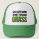 Funny GO OUTSIDE TOUCH GRASS Trucker Hut mit fett Typografie und grüne Gras Schrift.