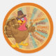 Fun Aufkleber - perfekt für Erntedank-Karten, Gastgeschenke und mehr! Ein farbenfroher Retro-inspirierter Hintergrund mit einem großen Truthahn, der einen Pilgerhut trägt und zwei Daumen hochhält, und der inspirierenden Botschaft: "Wenn du klatschen kannst, bis du wackelst, bist du gesegnet!"