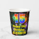 Ce design coloré et amusant de tasse en papier sur le thème de l'anniversaire comprend un grand nombre de "15" ayant un motif inspiré par un gradient de spectre arc-en-ciel. Il comporte également le message "Joyeux 15e anniversaire", et un nom personnalisable. L'arrière - plan présente un motif multicolore inspiré par les feux d'artifice de célébrations éclatants. Des tasses de papier colorées et vibrantes comme celle-ci peuvent être amusantes à avoir lors d’une fête d’anniversaire ou d’une fête qui se tient à l’occasion du 15e anniversaire de quelqu’un. [~Z0000539]