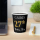 This opulent and fancy birthday-themed paper cup design features an editable name and the message “27th Birthday Party”. The large number “27th” has an imitation/faux gold-inspired coloring pattern, the words “Birthday Party” are in elegant script-style text, and the background is colored black by default (although it can be customized). Luxurious, elegant paper cups like this might be used at a birthday celebration being held to honor somebody’s 27th birthday. [~Z0000567]
