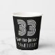 Cette tasse de papier d'anniversaire de style vintage et d'inspiration des années folles est ornée d'un grand numéro d'apparence d'inspiration art déco "33", en plus du message d'anniversaire "Joyeux 33ème anniversaire", et d'un nom personnalisé. Il dispose également d'une arrière - plan de couleur noire. Des tasses de papier sur le thème de l’anniversaire comme celle-ci pourraient être utilisées lors d’une fête célébrant le 33e anniversaire de quelqu’un. [~Z0000542]