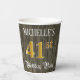 This luxurious and fancy birthday-themed paper cup design features a custom name and the message “41st Birthday Party”. The large number “41st” has an imitation/faux gold-inspired coloring pattern, the words “Birthday Party” are in ornate script-style text, and the background features an imitation/faux woodgrain-inspired pattern. Elegant, opulent paper cups like this might be useful at a birthday party being held to celebrate somebody’s forty first birthday. [~Z0000568]