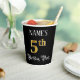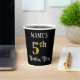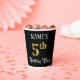 This opulent and luxurious birthday paper cup design features a personalized name and the message “5th Birthday Party”. The large number “5th” has a faux/imitation gold-inspired coloring pattern, and the words “Birthday Party” are in ornate script-style text. The background is colored black by default (although it can be customized). Fancy, elegant paper cups like this might be used at a birthday celebration/party being held to celebrate somebody’s fifth birthday. [~Z0000567]