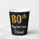 Ce design luxueux, élégant et sophistiqué de tasse de papier d'anniversaire comprend un grand numéro ordinal "80th" ayant une imitation/fausse apparence d'inspiration or, plus le message de voeux d'anniversaire "Happy 80th Birthday," et un nom personnalisé dans une police de style script. Il dispose également d'une arrière - plan de couleur noire. Des tasses de papier comme celle-ci peuvent être utilisées à une fête pour quelqu'un qui fête son 80e anniversaire. [~Z0000538]