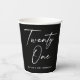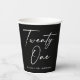 This modern paper cup features a bold black background paired with a clean handwritten “Twenty One” script, creating a sleek and contemporary look for a 21st birthday celebration. The design feels minimal yet expressive, making it easy to match with a wide range of party styles, from simple and understated to more elevated and coordinated themes. The deep black color gives the cup a refined presence at drink stations, dessert tables, and bar setups, adding a polished touch without overwhelming the decor. The clean script typography ensures the cup looks great in photos and adds a professional, curated feel to the entire event. Ideal for 21st birthday parties, modern minimal events, and black and white themes, where simple, stylish details make a big difference.
