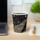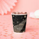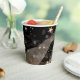 Beau design festif de tasse en papier avec étoiles dorées stylisées, cordes et bokeh sur arrière - plan noir.