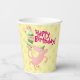Un cochon heureux sur des tasses de papier d'anniversaire. Utilisez "Personnalisez ce modèle" pour modifier le texte "Joyeux anniversaire !" et créer un message unique et customisé ; les changements de texte sont reflétés de part et d'autre. Accessoires de fête avec un cochon brillant, sous un gâteau de couche de teetering avec des éclats de glace verte et surmonté de bougies roses.