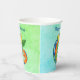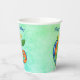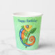 Ces tasses en papier sont un mélange de tons bleu et vert avec un lézard imaginaire festif aux couleurs vives de vert, bleu, jaune, orange tenant une feuille verte sur un bâton. Customisez le texte Joyeux anniversaire avec les modèles à l'avant et à l'arrière.