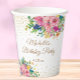 Elégante aquarelle rose, bleu et jaune fleurie sur des tasses de papier blanc de fête d'anniversaire, personnalisée avec le nom de l'invitée d'honneur et sa date de fête. Contactez-nous pour obtenir de l'aide sur la personnalisation ou pour demander des produits correspondants.