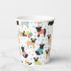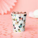 Cute birthday party Pug dogs with black and tan coats dressed in cute birthday outfits with balloons, cake and confeti pattern.