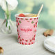 Ces amusantes tasses de papier d'anniversaire "berry first" ont un motif de fraise élégant, rouge sur arrière - plan rose avec une police contrastée.