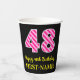 Ce joyeux autocollant carré à thème d'anniversaire comporte un grand numéro "48" avec un motif rose foncé et rose clair rayures, avec le message "Happy 48th Birthday,", et un nom personnalisé. L'arrière - plan est noir de couleur. Des tasses en papier gaies comme celle-ci peuvent être amusantes à utiliser lors d’une fête en l’honneur du quarante-huitième anniversaire de quelqu’un. [~Z0000580]