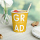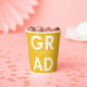 Coupes de papier de graduation personnalisées avec "Grad" en caractères blancs gras avec un arrière - plan jaune ou la couleur de votre choix. Personnalisez les tasses de papier de graduation en ajoutant le nom du diplômé et l'année de graduation. Les tasses jaunes de papier de fin d'études sont parfaites pour les fêtes de fin d'études secondaires et collégiales.