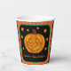 Amusants tasses de fête Halloween pour enfants et adultes avec un grand citrouille orange comme image focale. Il a un visage taillé brillant en égrenage. En bas du citrouille se trouve un modèle en orange qui lit Happy Halloween. Vous pouvez le laisser tel quel ou utiliser la zone de modèle pour le remplacer par votre propre message ou texte. Le citrouille et le texte sont placés à l'intérieur d'un carré noir aux étoiles orange, sur le bord des tasses sont des rayures claires et orange foncé. Amusez-vous pour une fête éffrayante pour votre famille et vos amis.
