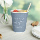Des tasses en papier bleu poussiéreux pour votre réception de mariage, des fêtes de fiançailles, des dîners de répétition, des douches en couple et d'autres célébrations mariages qui présentent "Happily Ever After" dans une typographie blanche moderne et simple et un script blanc élégant avec des swashes, vos prénoms rejoints par un coeur et votre date mariage.
