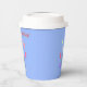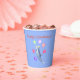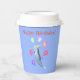 Des tasses en papier avec ma conception d'un dauphin bondissant entouré de ballons, portant un casquette de fête. Le texte dit "Joyeux anniversaire !"