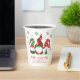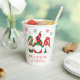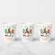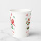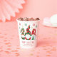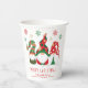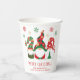 Coupes en papier mignonnes pour votre fête de Noël ou vaisselle de vacances à la maison avec 3 gnomes scandinaves habillés de casquettes rouges et verts saisonniers, flocons de neige, "Joyeux Noël" et votre nom ou événement dans une amusante typographie rouge.