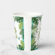 Complete your dino-mite baby shower theme with these delightful personalized paper cups! The design features a sweet watercolor illustration of a little dinosaur hatching from its egg, a tiny blue bird friend perched on top, and a little dino toy car on the side. The phrase "IT'S A BOY!" is printed in a fun blue font, along with "Samantha's BABY SHOWER" and the date, making each cup a personalized part of the celebration. The entire cup is framed by a lush border of watercolor tropical leaves, giving it a fun, jungle-like feel. These sturdy paper cups are perfect for both hot and cold beverages and are a must-have for a boy's baby shower.