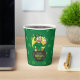 Tasses en papier avec l'illustration d'un leprechaun souriant portant un costume vert, une cravate en arc et un casquette de bowler assis à l'intérieur d'une casserole d'or et tenant une pinte de bière, avec arc-en-ciel jaune, vert et orange dans l'arrière - plan. L'image est placée sur un arrière - plan vert foncé transparent avec des shamrocks. Un design parfait pour célébrer la Saint Patrick !