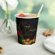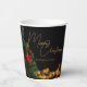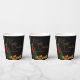 Ces somptueuses tasses en papier Joyeux Noël sont ornées d'une écriture manuscrite dorée moderne sur des lumières scintillantes à côté d'un arbre de Noël festif décoré d'ornements rouges et verts. Customisez cet élégant décor de fête de vacances avec script personnalisé sur le ciel noir de nuit.