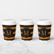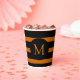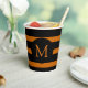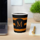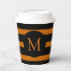 Ce design élégant présente des rayures horizontales orange et noir avec un monogramme rond noir centre et la lettre en bloc orange pour les fêtes de fin d'année.
