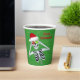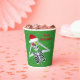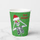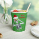 Ces tasses en papier sont vertes avec de minuscules taches d'or et un squelette amusant tenant des ornements couverts de flocon rouge et vert jusqu'à ses yeux portant un chapeau de Père Noël rouge avec Joyeux texte de Noël en rouge sur le devant et le dos.