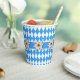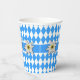 Tasses en papier de l'Oktoberfest faites dans le traditionnel motif à carreaux bleu et blanc de l'Oktoberfest, avec des graphiques des fleurs alpines blanches appelées Edelweiss, courant à travers le milieu.