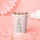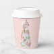 Ce design de tasse en papier présente un château de biscuits en pain d'épices pastel branché, composé de 4 couches de maisons de biscuits. Les couleurs comprennent le rose clair, le bleu clair et le vert clair et bronzent sur un arrière - plan rose avec un motif de flocon blanc.