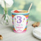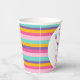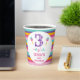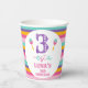 Purple Number Trois-esta 3e Anniversaire Papier Cups Fête Fête Fille troisième anniversaire tasse de papier avec un motif rayé coloré, grand nombre violet, quelques maracas et un texte multicolore.