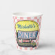 Célébrez votre anniversaire ou toute autre occasion avec une soirée vintage de saut de chaussettes des années 1950. Ces mignonnes tasses en papier ont un look rétro diner avec une enseigne graphique et un arrière - plan à damiers rose et blanc. Toutes les oeuvres sont originales. Ajoutez facilement votre nom au panneau du diner avec le champ de modèle personnalisé. Ces tasses en papier cool vous feront bouger toute la nuit des années cinquante.