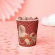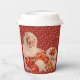 Tasse en papier de vacances avec des flocons de neige blancs sur l'arrière - plan rouge et le Père Noël avec des cloches de traîneau.