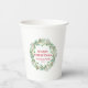Élégantes tasses en papier de Noël avec "Joyeux Noël" avec votre nom de famille et année en rouge entourée d'une couronne verdoyante. Ces tasses en papier de fin d'année ajouteront une touche festive à vos fournitures de Noël.